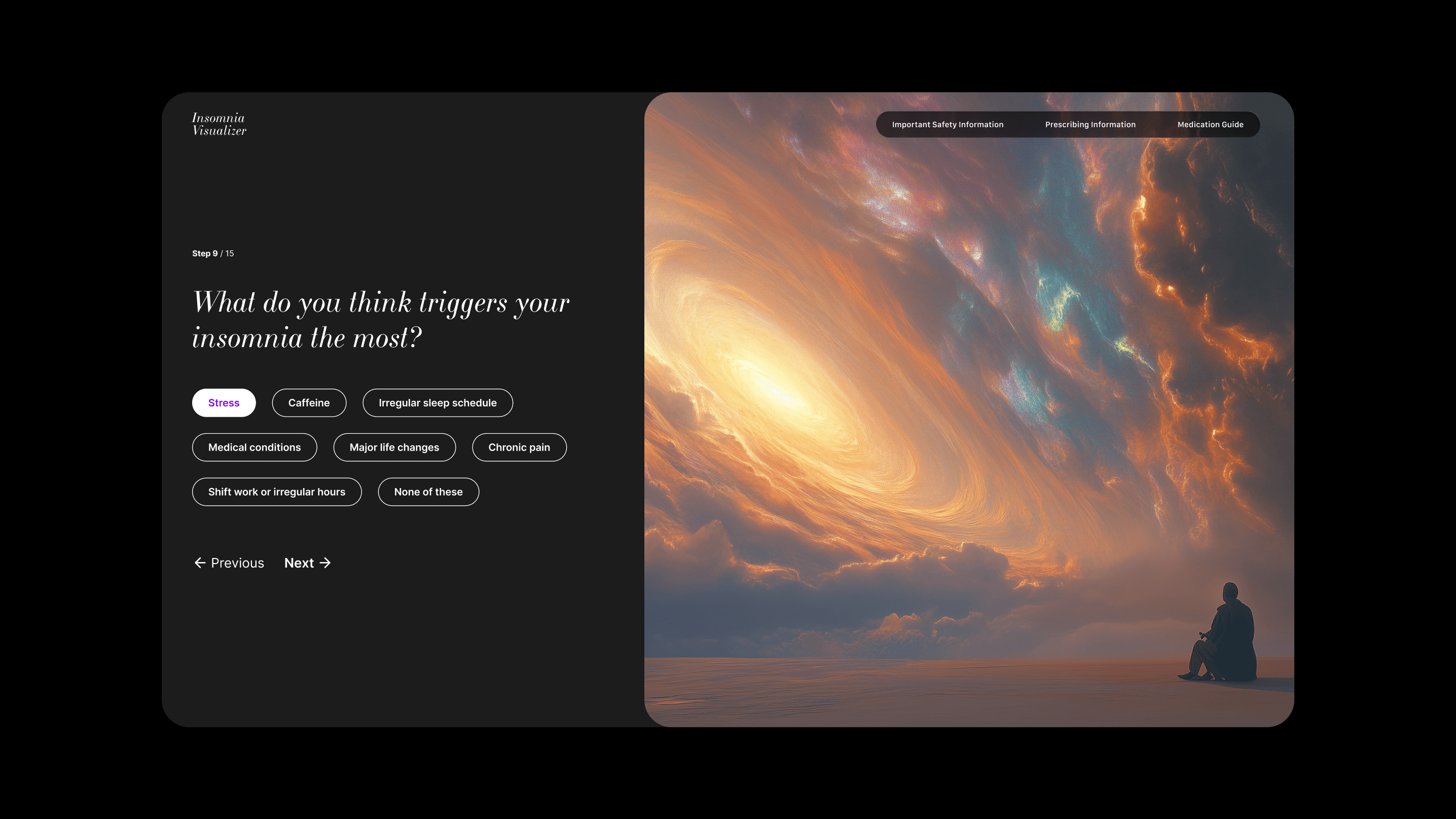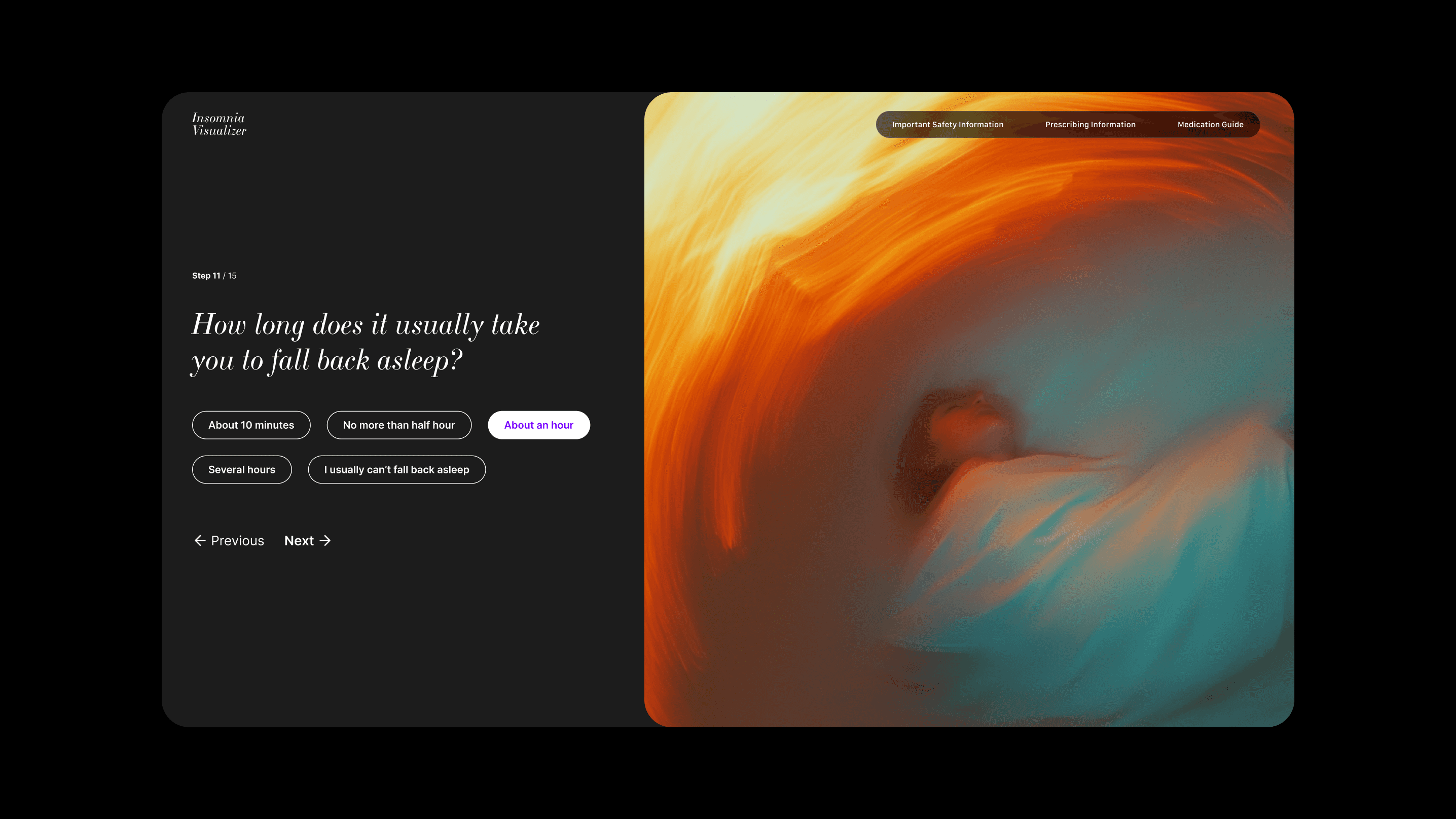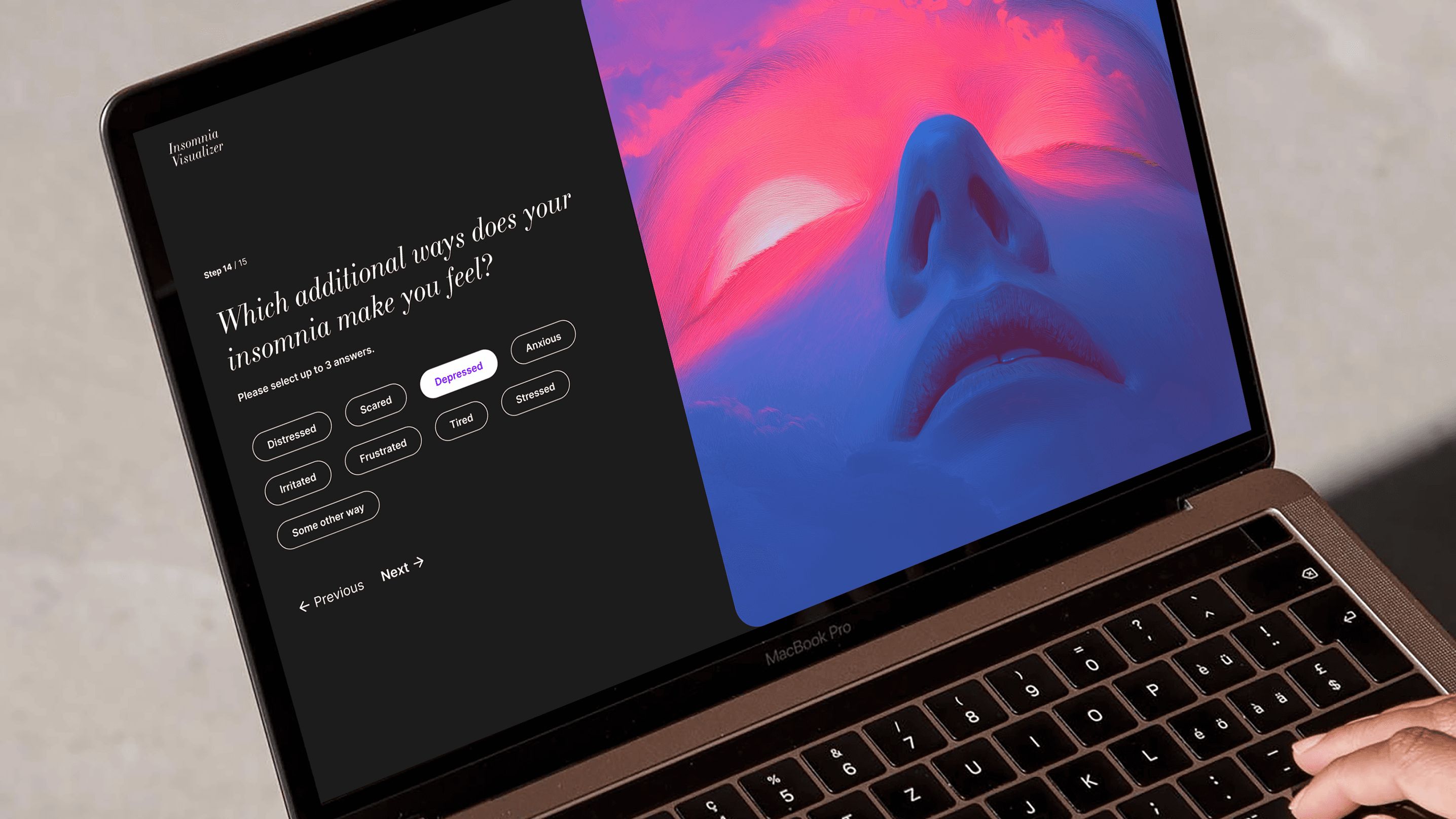 The Insomnia Visualizer is an interactive tool designed to help users articulate and visualize their insomnia experience—an often hard-to-describe condition. By leveraging AI technology, this tool transforms user inputs into personalized visuals, enabling better communication with healthcare providers or simply helping individuals better understand their own experiences