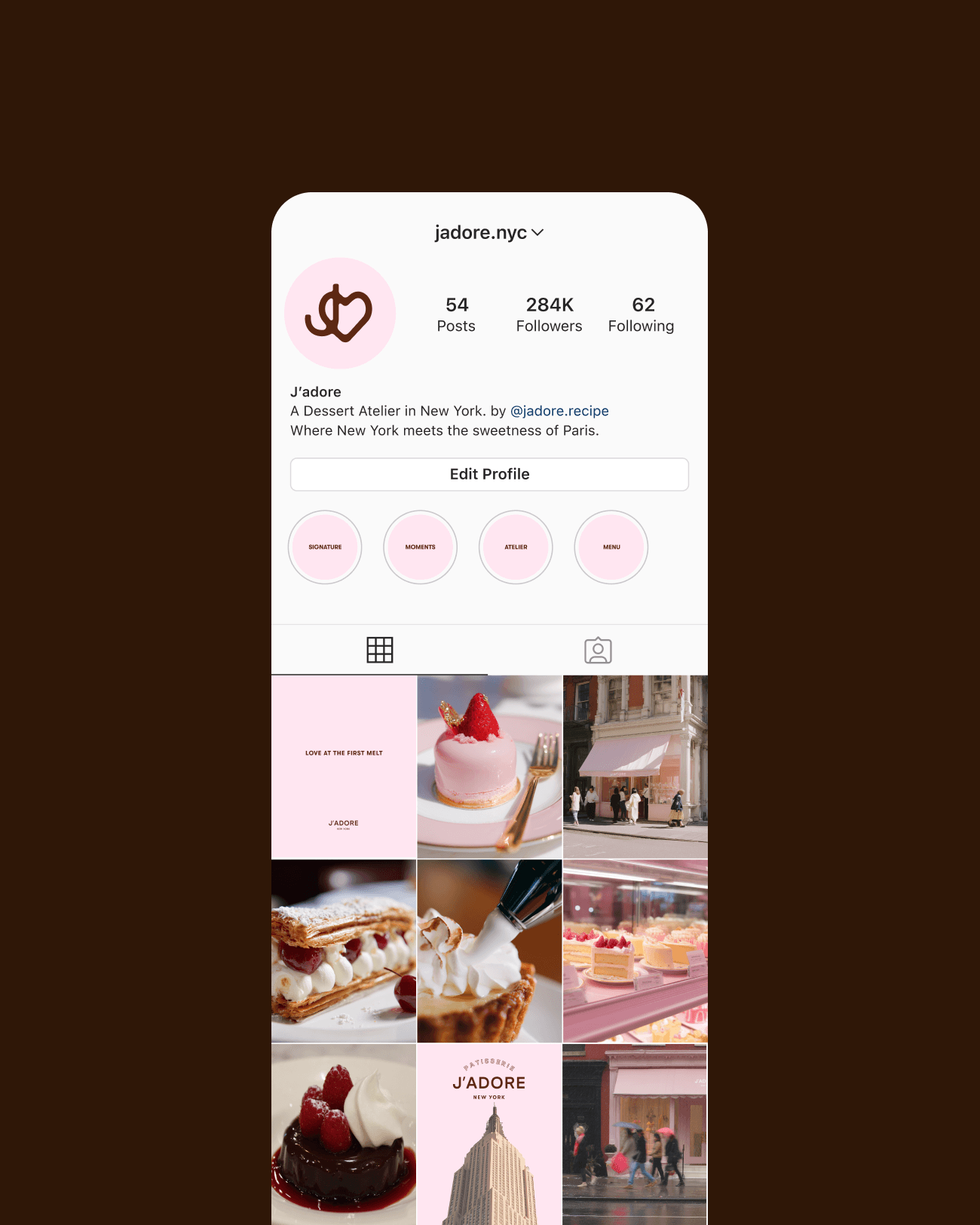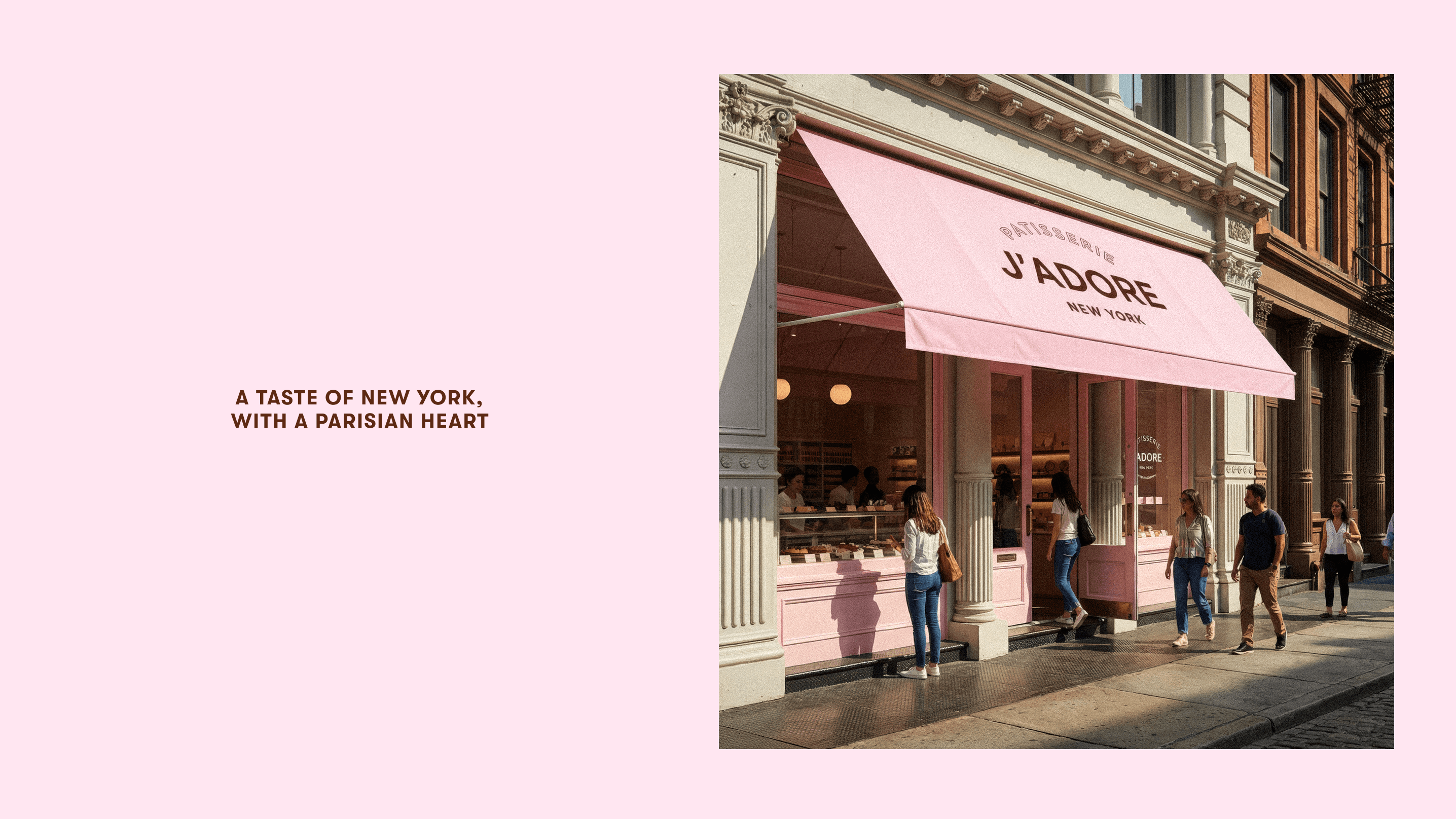 Founded by a Michelin-trained pastry chef shaped by New York’s fine-dining kitchens, J’adore New York sought to translate the warmth of home baking into a contemporary brand presence. The challenge was balancing intimacy and indulgence while positioning the brand within a competitive urban market.